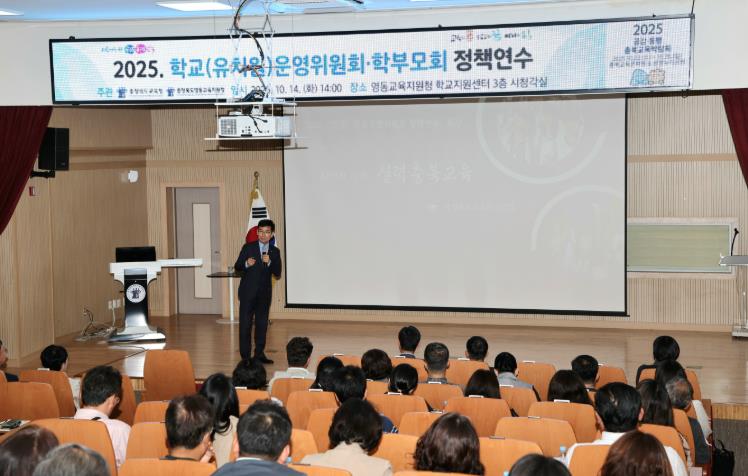 [무한뉴스=정민정 기자] 충청북도영동교육지원청은 14일 영동교육지원청 학교지원센터 3층 시청각실에서 관내 유·초·중·고등학교 운영위원, 학부모회 임원, 학교(원)장, 행정실장 120여 명을 대상으로 2025. 학교(유치원)운영위원회·학부모회 정책연수를 실시했다.
