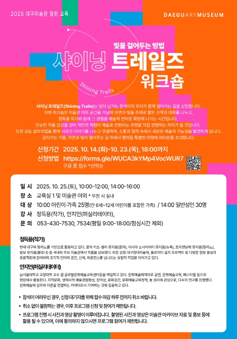 [무한뉴스=최진수 기자] 대구문화예술진흥원 대구미술관은 오는 10월 25일, 오전 10시, 오후 2시, 총 2회에 걸쳐 열린 교육 ‘샤이닝 트레일즈 워크숍: 빛을 걸어 두는 방법’을 운영한다.