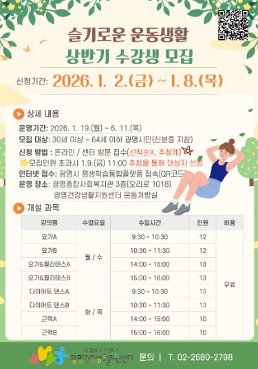 [무한뉴스=정승훈 기자] 광명시 광명건강생활지원센터는 새해를 맞아 시민들의 건강한 생활습관 형성과 만성질환 예방을 위해 2026년 상반기 ‘슬기로운 운동생활’ 운동 프로그램 참여자를 모집한다.