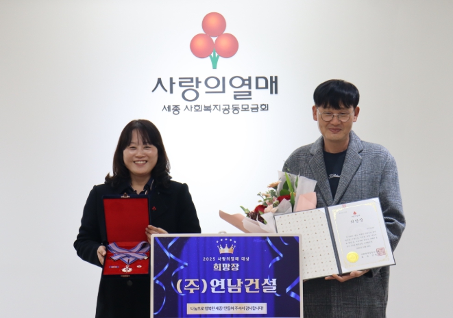 [무한뉴스=정민정 기자] ㈜연남건설(대표 박성윤)은 사회복지공동모금회가 주최하는 ‘2025년 제12회 사랑의열매 대상’에서 기부분야 ‘희망장’을 수여해 전달식을 가졌다고 세종사회복지공동모금회(회장 박상혁)에서 전했다.