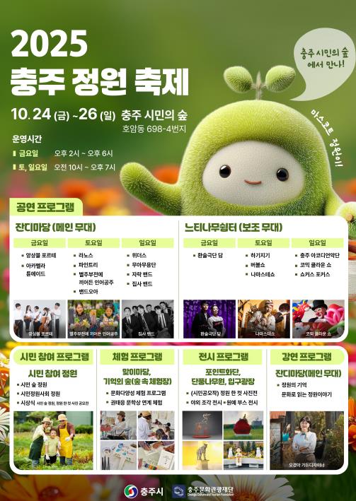 [무한뉴스=정민정 기자] 충주시와 (재)충주문화관광재단은 10월 24일부터 26일까지 3일간 충주 시민의 숲(호암동 698-4번지)에서 ‘2025 충주 정원 축제’를 개최한다고 밝혔다.