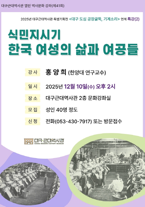 [무한뉴스=최진수 기자] (재)대구문화예술진흥원 박물관운영본부 소속 대구근대역사관은 '대구 도심 공장굴뚝, 기계소리 -근대 대구 섬유 읽기-' 특별기획전과 연계해 12월 10일 오후 2시에 ‘식민지시기 한국 여성의 삶과 여공들’을 주제로 제41회 열린 역사문화 강좌를 개최하며, 참가자를 모집한다.