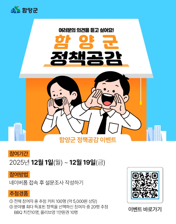 함양군 관계자는 “누구나 쉽게 참여해 정책에 대한 생각을 나눌 수 있는 자리인 만큼 많은 관심과 참여를 바란다”라며 “여러분의 선택이 앞으로의 군정 방향을 더 풍성하게 만드는 데 큰 힘이 될 것”이라고 말했다.