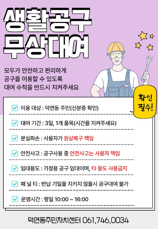 [무한뉴스=정민정 기자] 순천시 덕연동 주민자치회(회장 장성욱)는 주민들의 생활 편의를 높이고 공유 및 나눔 문화 확산을 위해 오는 8일부터 ‘생활공구 무상대여 사업’을 운영한다고 밝혔다.