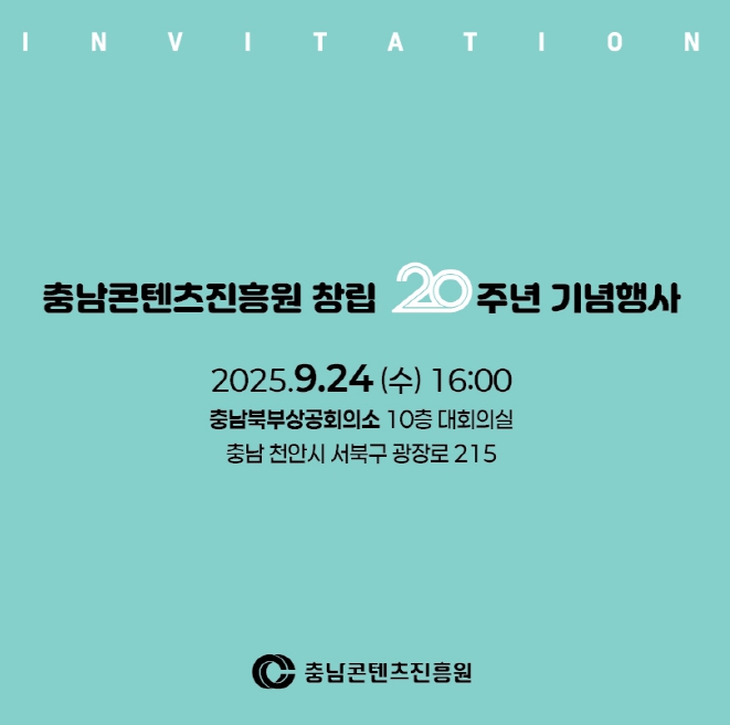 [무한뉴스=정민정 기자] 충남콘텐츠진흥원은 오는 9월 24일 오후 4시 충남북부상공회의소 10층 대회의실에서 창립 20주년 기념행사를 개최한다고 밝혔다.