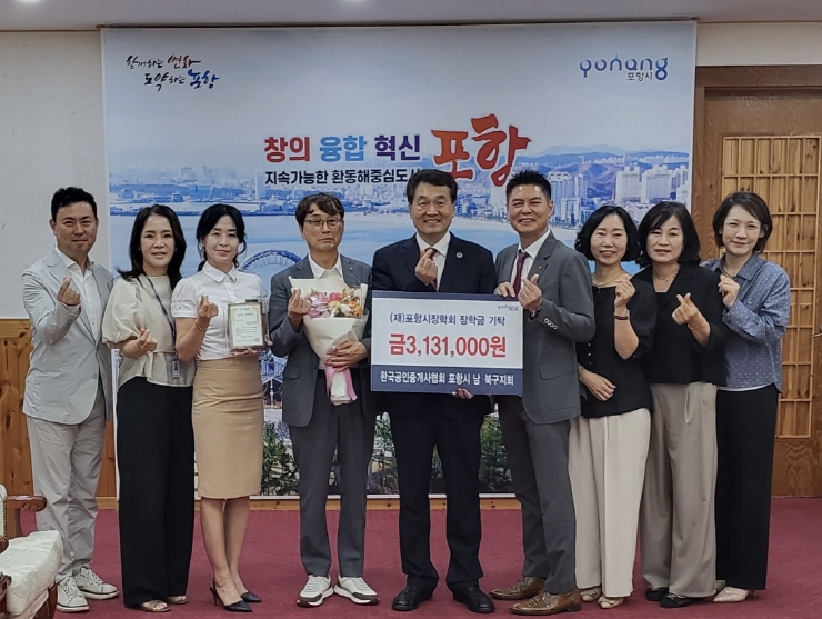 [무한뉴스=최진수 기자] 한국공인중개사협회 경상북도지부 포항시 남·북구지회는 18일 포항시 장학회에 장학금 3,131,000원을 기탁하며 지역 인재 육성에 힘을 보탰다.