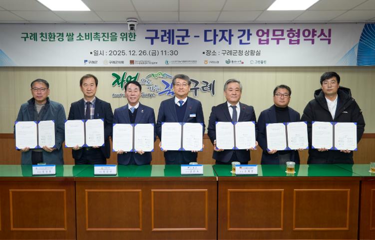 김순호 구례군수는 “이번 협약은 친환경 쌀을 단순한 농산물이 아니라 환경과 건강, 지역경제를 함께 살리는 공공적 가치로 확산시키기 위한 출발점”이라며, “공공과 민간이 함께 참여하는 협력 모델을 통해 친환경 농업의 미래를 구체적으로 만들어 가겠다”고 밝혔다.