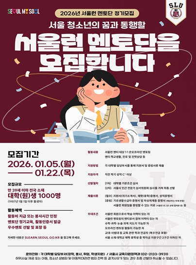 [무한뉴스=정승훈 기자] 서울시는 대학생들이 자신의 지식과 경험을 나누며 장학금 혜택과 취업 역량까지 쌓을 수 있는 ‘서울런 멘토단’ 신규 멘토 1,000명을 22일까지 모집한다.