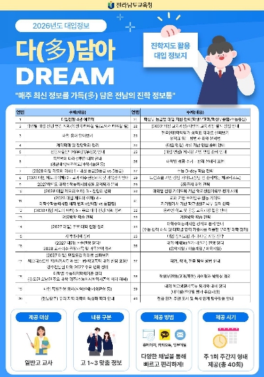 [무한뉴스=정승훈 기자] 전라남도교육청이 급변하는 대입 환경에 선제적으로 대응하고 학교 현장의 진학지도 역량을 강화하기 위해 맞춤형 대입 정보지 ‘다(多)담아 DREAM’을 발간·운영한다.