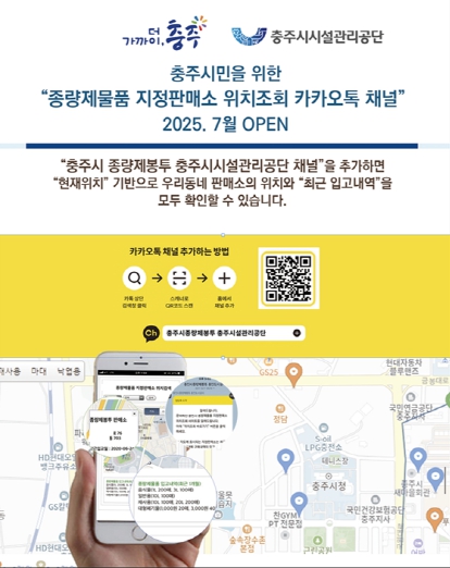 충주시시설관리공단(이사장 정광섭, 이하 공단)은 시민들이 종량제봉투를 보다 편리하게 구매할 수 있도록 카카오톡 채널을 활용한 ‘종량제봉투 판매소 위치 및 판매 물품 조회 서비스’를 도입했다.