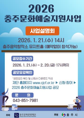 [무한뉴스=정민정 기자] (재)충주문화관광재단은 충주시 예술인 및 예술단체의 창작활동 기반을 마련하여 문화예술 생태계를 조성하고자 1월 19일부터‘2026 충주문화예술지원사업’공모를 진행하고 있다고 밝혔다.