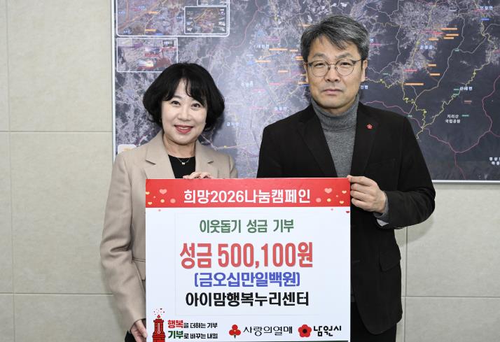 [무한뉴스=정민정 기자] 남원시는 지난 20일, 아이맘행복누리센터가 ‘희망 2026 나눔 캠페인’에 성금 50여만 원을 기부했다고 밝혔다.