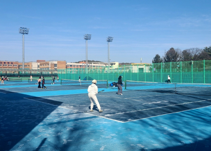 | ▲ 성사체육공원 내 시립 테니스장에서 고양시여성테니스연맹 회원들이 테니스를 치고 있다. |