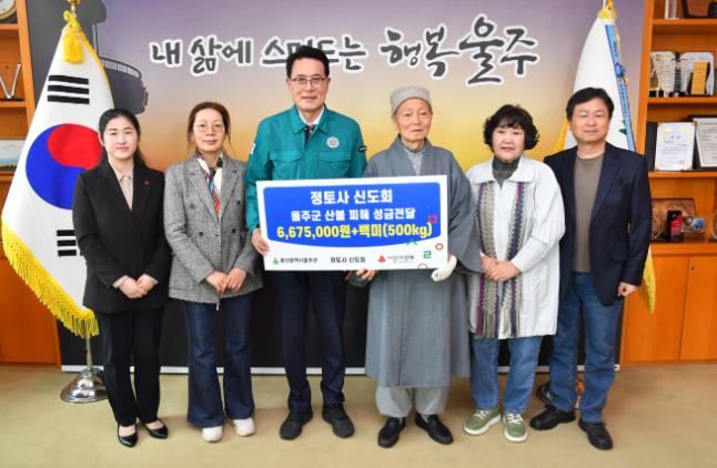 [무한뉴스=최진수 기자] 정토사 신도회가 3일 군청 소회의실에서 이순걸 군수와 이장숙 신도회장 등 관계자들이 참석한 가운데 울주군 산불 피해 성금 667만5천원과 백미 500㎏를 전달했다.