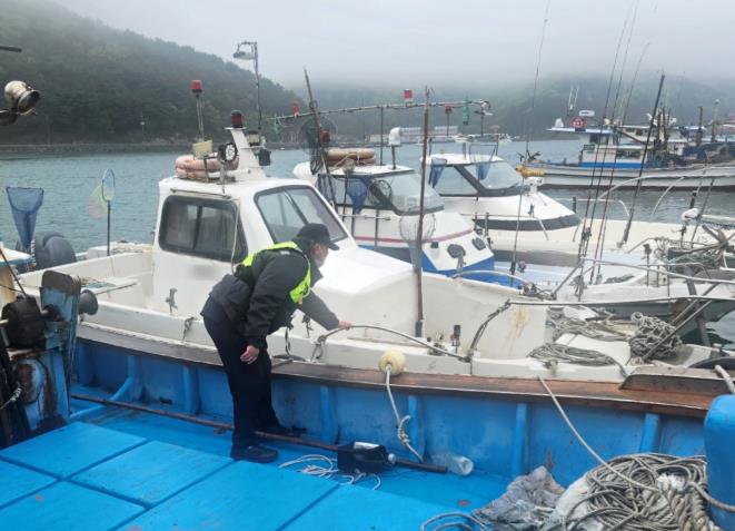 | ▲ 사천해경, 연안 안전사고 위험예보제「관심」 발령에 따른 계류선박 점검 모습 |