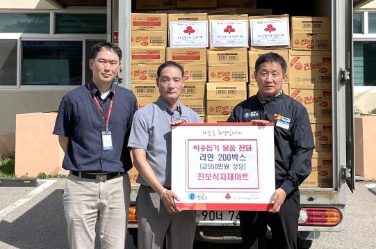[무한뉴스=최진수 기자] 청송군은 지난 17일 추석 명절을 앞두고 진보면 소재 진보식자재마트(대표 박건)에서 550만 원 상당의 라면 200상자를 진보면에 기탁받았다고 밝혔다.