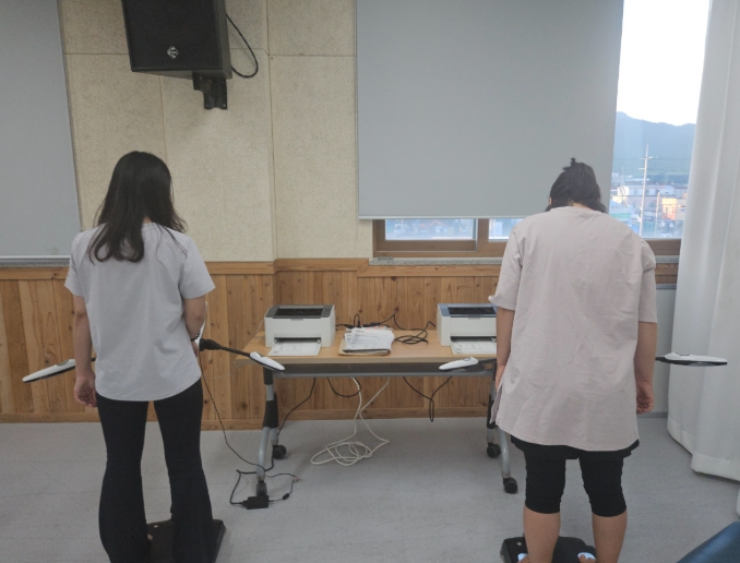 | ▲ 직장인들이 신체활동에 임하고 있다. 2. 참여자들이 사업전‧후 체성분검사를 시행하고 있다. |