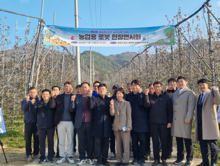 [무한뉴스=최진수 기자] 포항시는 26일 죽장면 상옥리 사과원에서 농촌진흥청, 한국농업기술진흥원, 경상북도, 지역 농업인 등 관계자 70여 명이 참석한 가운데 방제·운반·모니터링 로봇을 활용한 과수(사과)분야 현장 연시회를 개최했다.