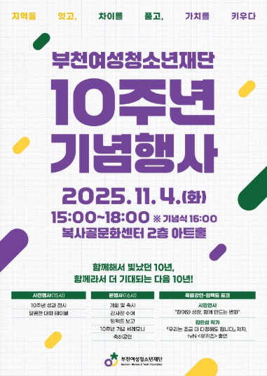 [무한뉴스=정승훈 기자] 부천여성청소년재단은 11월 4일 오후 3시부터 복사골문화센터 2층 아트홀에서 설립 10주년 기념행사를 개최한다. 이번 행사는 지난 10년간의 발자취를 돌아보고, 시민과 함께 만들어갈 다음 10년을 그려보기 위해 마련됐다.