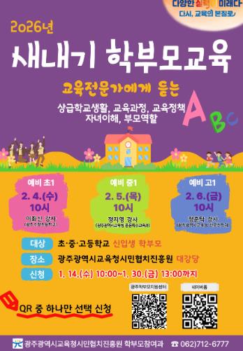 [무한뉴스=정승훈 기자] 광주시교육청시민협치진흥원은 오는 2월 4~6일 본원 대강당에서 초·중·고등학교 신입생 학부모를 대상으로 ‘2026년 새내기 학부모교육’을 운영한다.