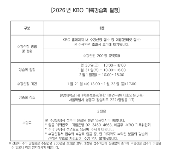 [무한뉴스=최진수 기자] 2026년 KBO 기록강습회가 1월 30일(금)부터 2월 1일(일)까지 서울 한양대학교에서 개최된다. 기록강습회는 야구 공식기록법의 보급과 이해를 통한 저변 확대를 목적으로 프로야구 원년인 1982년부터 개최됐다.