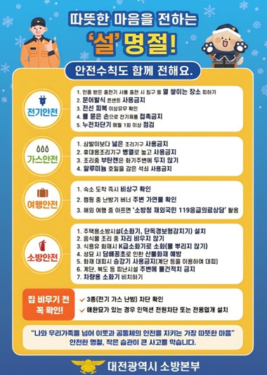 [무한뉴스=정민정 기자] 대전소방본부는 2월 설 명절을 앞두고 1월 19일부터 2월 15일까지‘설 명절 대비 화재예방대책’을 추진한다.