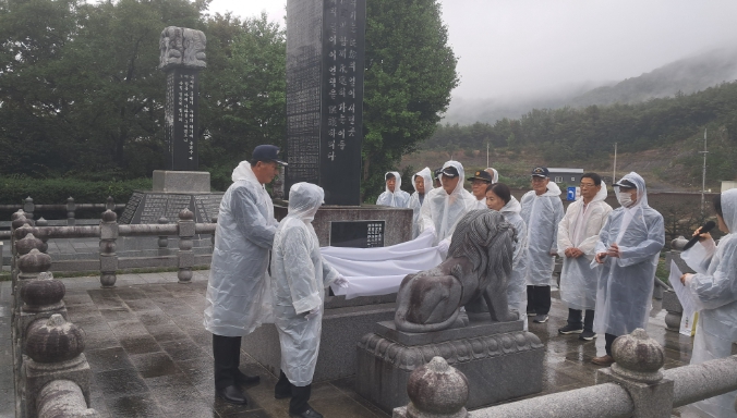 [무한뉴스=최진수 기자] 군위군은 10월 16일 군위읍 오곡리에 위치한 무공수훈자 전공비 앞에서 ‘무공수훈자 명각 기념식’을 개최하고, 새롭게 무공훈장을 서훈받았거나 기존 명단에서 누락된 4분의 무공수훈자 성함을 전공비에 새겨 올렸다.