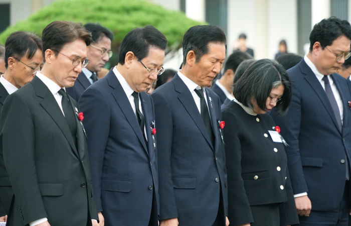 | ▲ 김영록 전라남도지사가 19일 구례군 지리산역사문화관에서 열린 ‘여순사건 제77주기 합동추념식’ 행사에서 김민석 국무총리, 정청래 민주당 대표 등 국회의원들과 희생자들에 대한 묵념을 하고 있다. |