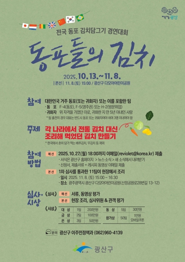 [무한뉴스=정민정 기자] 광주 광산구가 13일부터 11월 18일까지 전국 곳곳에 거주하고 있는 동포들을 대상으로 ‘전국 동포 김치담그기 경연대회_동포들의 김치’를 개최한다.