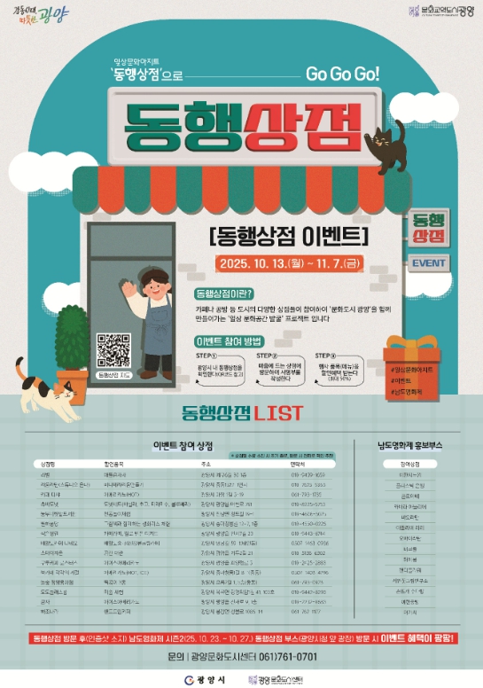[무한뉴스=정민정 기자] 광양문화도시센터는 10월 13일부터 11월 7일까지 관내 ‘동행상점’ 15개소에서 시민 참여 이벤트를 진행한다고 밝혔다.