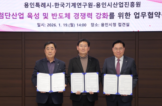 [무한뉴스=정윤식 기자] 용인특례시는 19일 시청 접견실에서 한국기계연구원(KIMM), 용인시산업진흥원과 ‘첨단산업 육성 및 반도체 경쟁력 강화를 위한 업무협약’을 체결했다.