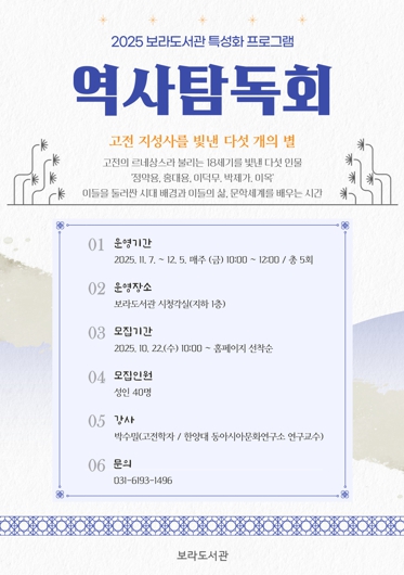 시 관계자는 “역사 탐독회는 전통·역사 특성화 도서관인 보라도서관의 대표 교양 교육 프로그램”이라며 “이번 강의가 시민들이 고전과 역사적 인물을 탐구하며 인문학적 소양을 확대할 수 있는 계기가 됐으면 한다”고 말했다.