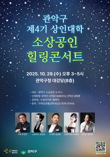 [무한뉴스=정승훈 기자] 관악구는 오는 10월 29일 오후 3시, 구청 8층 대강당에서 관내 소상공인을 위한 힐링콘서트를 개최한다.