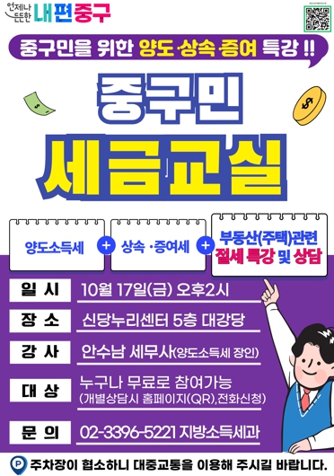 [무한뉴스=정승훈 기자] 서울 중구가 어렵게만 느껴지는 세금에 대한 이해를 돕기 위해 오는 17일 오후 2시 신당누리센터 5층 대강당에서 '중구민 세금교실' 특강을 연다.