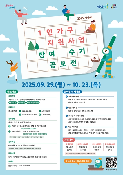 [무한뉴스=정승훈 기자] 서울시가 1인가구 지원사업의 성과를 공유하고 참여자들의 생생한 목소리를 담아내기 위해 '2025년 1인가구 지원사업 참여 수기 공모전'을 개최한다.