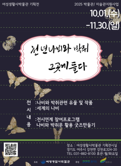 [무한뉴스=정충근 기자] 여주시에서 진행하는 2025년 박물관·미술관 지원사업의 일환으로 여성생활사박물관의 ‘천년 나비와 박쥐 그곳에 들다’ 전시가 10월 1일부터 11월 30일까지 개최된다.