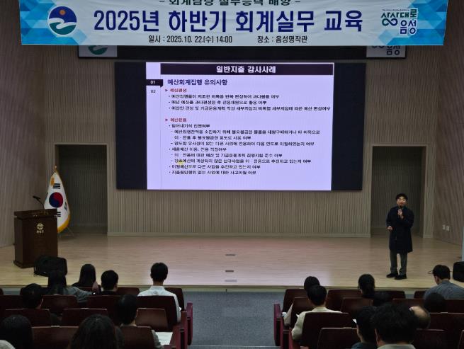 [무한뉴스=정민정 기자] 음성군은 22일 음성명작관에서 회계 담당 군 공직자 130여 명을 대상으로 ‘2025년 하반기 회계실무 교육’을 실시했다.