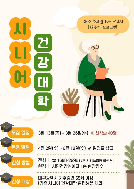 강연숙 대구광역시 건강증진과장은 “시니어 건강대학은 단순한 교육 프로그램을 넘어 어르신들이 서로 소통하고 경험을 나눌 수 있는 사회적 교류의 장이다”며, “이곳에서 건강관리에 대한 지식을 배우고, 정서적 지지를 받으며, 풍요로운 노후를 즐길 수 있는 기회를 누리시길 기대한다”고 말했다.