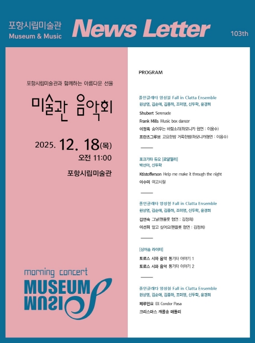 [무한뉴스=최진수 기자] 포항시립미술관은 오는 18일 오전 11시, 제103회 미술관 음악회 ‘MUSEUM · MUSIC’를 개최한다.