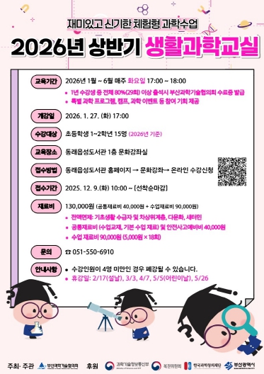 [무한뉴스=최진수 기자] 부산 동래구는 2026년 1월부터 동래읍성도서관과 안락누리도서관, 온빛어린이 작은도서관에서 부산과학기술협의회와 연계해 관내 초등학생을 대상으로 ‘생활과학교실'을 운영한다고 밝혔다.