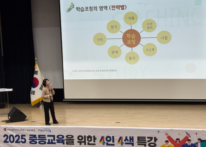 [무한뉴스=정민정 기자] 전북특별자치도교육청은 23일 창조나래 3층 시청각실에서 중등 교장(감), 교사, 교육전문직원 200여 명을 대상으로 ‘2025 중등 학력신장 4인 4색’ 세 번째 특강을 개최했다.