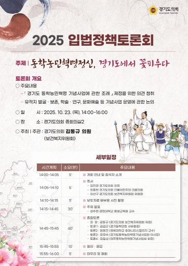 [무한뉴스=양현명 기자] 경기도의회 김동규 의원(더불어민주당, 안산1)은 오는 10월 23일 오후 2시, 경기도의회 중회의실2에서 '동학농민혁명정신, 경기도에서 꽃피우다' 입법정책토론회를 개최한다고 밝혔다.
