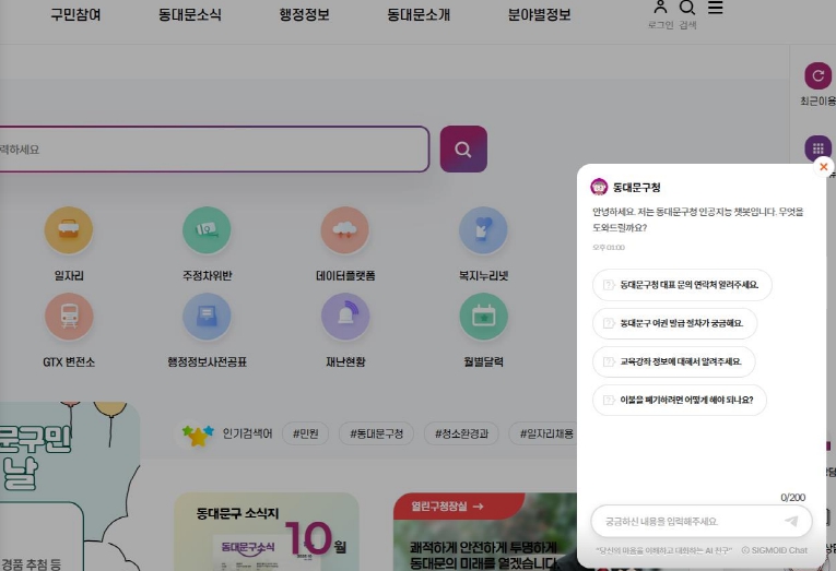 [무한뉴스=정승훈 기자] 서울 동대문구는 지난 20일부터 생성형 인공지능(AI)을 기반으로 한 누리집 챗봇 서비스를 본격 운영하고 있다고 밝혔다.