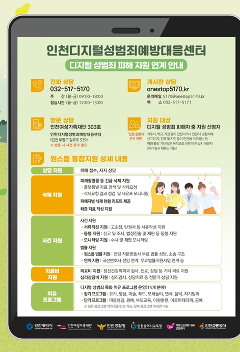 [무한뉴스=정승훈 기자] 인천디지털성범죄예방대응센터는 디지털 성범죄 피해자에 대한 ▲상담 지원 ▲삭제 지원 ▲사건 지원 ▲치료비 지원 ▲특화 치유 프로그램 운영 등 디지털 성범죄 피해자의 상담부터 피해 회복까지 원스톱 통합지원을 실시하는 기관으로, 2021년 6월 14일 인천광역시가 인천여성가족재단에 설치하여 운영하고 있다.