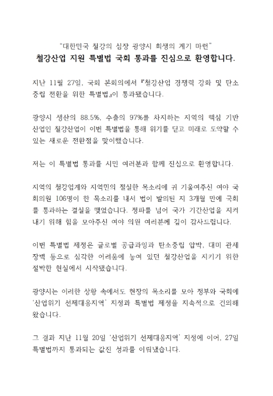 [무한뉴스=정민정 기자] 광양시는 지난 11월 27일 국회 본회의에서 '철강산업 경쟁력 강화 및 저탄소 전환 촉진을 위한 특별법(이하 ‘K-스틸법’)'이 통과된 데 대해 환영의 뜻을 밝혔다.