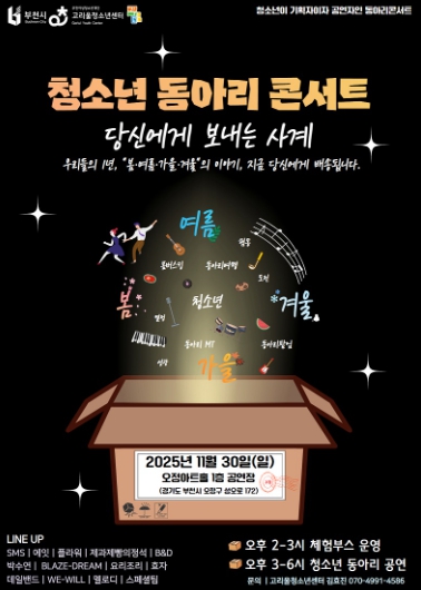 [무한뉴스=정승훈 기자] 부천여성청소년재단이 운영하는 고리울청소년센터는 2025년 11월 30일, 부천시 고강동 소재 오정아트홀 1층 공연장에서 지역 청소년들이 직접 기획하고 무대에 오르는 특별한 공연, ‘청소년 동아리 콘서트 – 당신에게 보내는 사계’가 열린다.