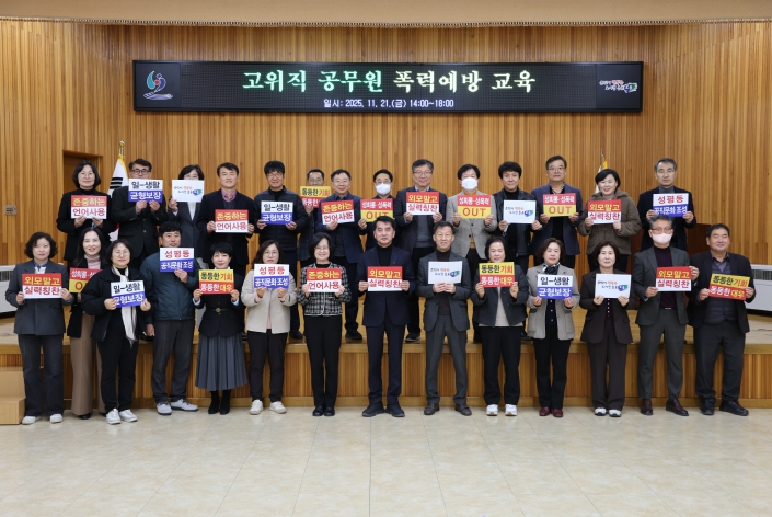 이번 교육은 ‘고위직 대상 별도 4대 폭력예방 교육 의무화’에 따라 양성평등 의식을 제고하고 건전한 공직문화를 조성하기 위해 마련된 것으로, 한국서비스교육원 김춘애 원장을 초빙해 △관리자의 책임과 의무 △성인지 기반의 폭력 예방 인식 강화 △성평등한 조직문화 조성 전략 등을 중심으로 4시간 동안 진행됐다.