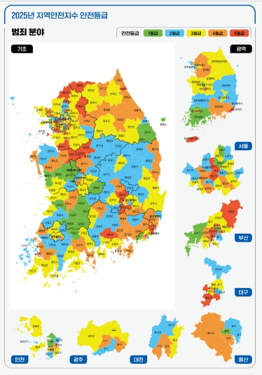 지역안전지수는 「재난 및 안전관리 기본법」에 따라 행정안전부에서 2015년부터 매년 공표하는 지표로 국가기관 통계를 활용해 지방정부의 6개 분야별 안전수준을 1~5등급으로 측정하며 숫자가 낮을수록 상대적으로 안전수준이 높은 것을 의미한다.