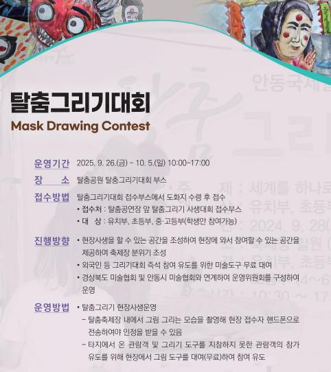 안동시는 “세계탈춤그리기대회는 어린이와 청소년이 축제를 함께 만들어 가는 주인공이 되는 기회”라며 “아이들의 창의적인 시선 속에서 탈춤의 새로운 가치를 발견할 수 있을 것”이라고 밝혔다.