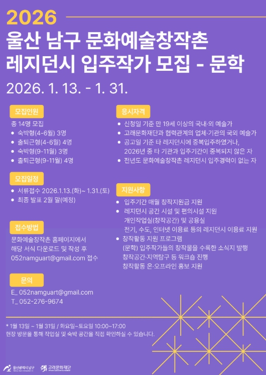 [무한뉴스=최진수 기자] 고래문화재단이 운영하는 울산 남구 문화예술창작촌이 2026년도 레지던시 사업에 참여할 입주작가를 1월 13일부터 1월 31일까지 공개 모집한다.
